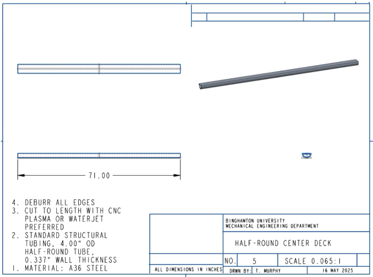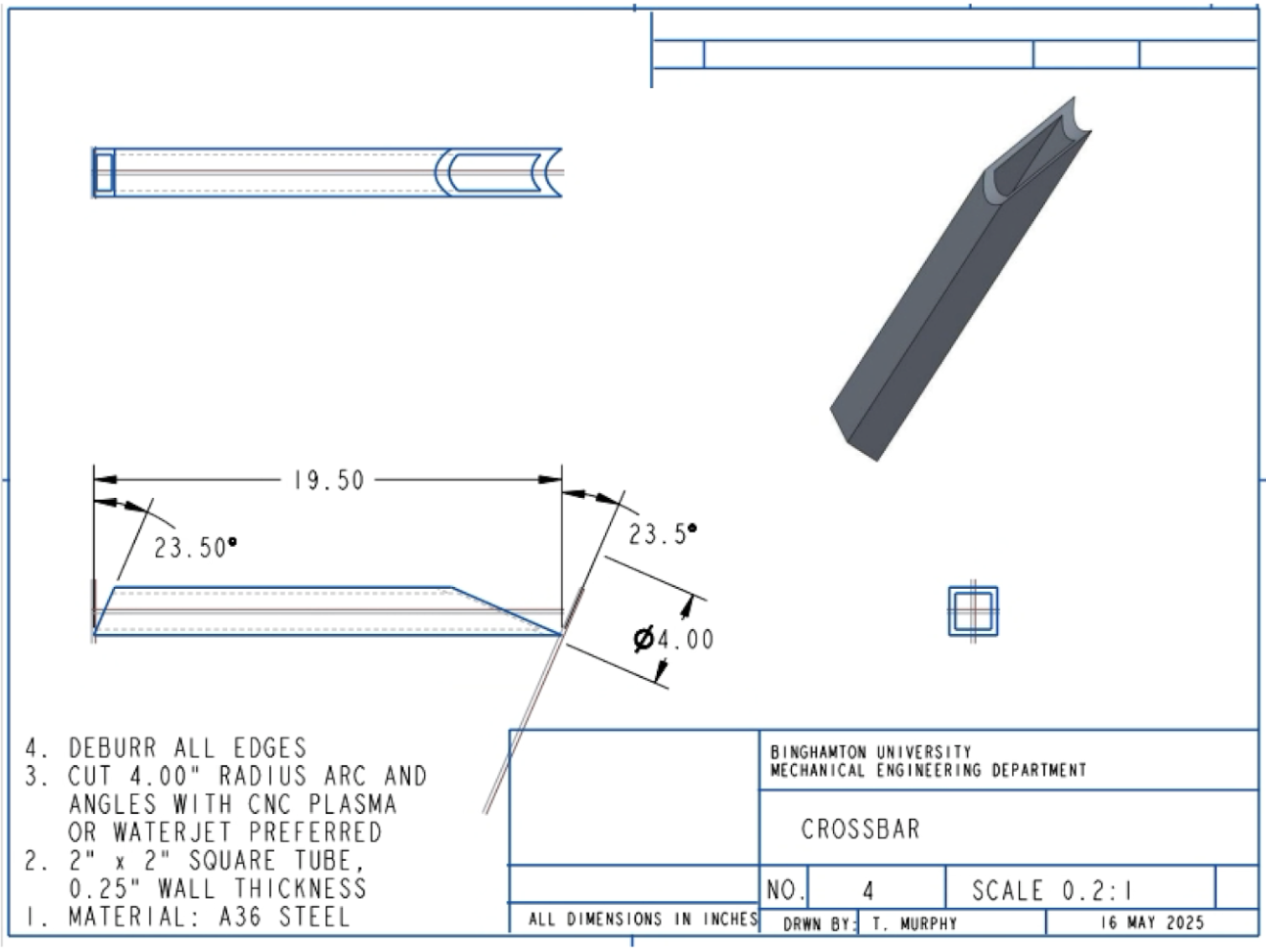The design prioritizes ease of fabrication and cost efficiency through the use of standard steel stock and straightforward shop processes. The main hitch insert is made from 2x2-inch A36 steel square tubing reinforced with sheet steel gussets for added strength and stability during welding. The half-round steel center deck, serving as the primary load-bearing member, is welded directly to the hitch insert, with its wall thickness optimized in MATLAB to balance weight and stiffness. Crossbars made from 2x2-inch tubing are welded across the assembly to reduce bending moments, while 1x1-inch wheel guides are welded to the flat top of the center deck to secure the bike tires.