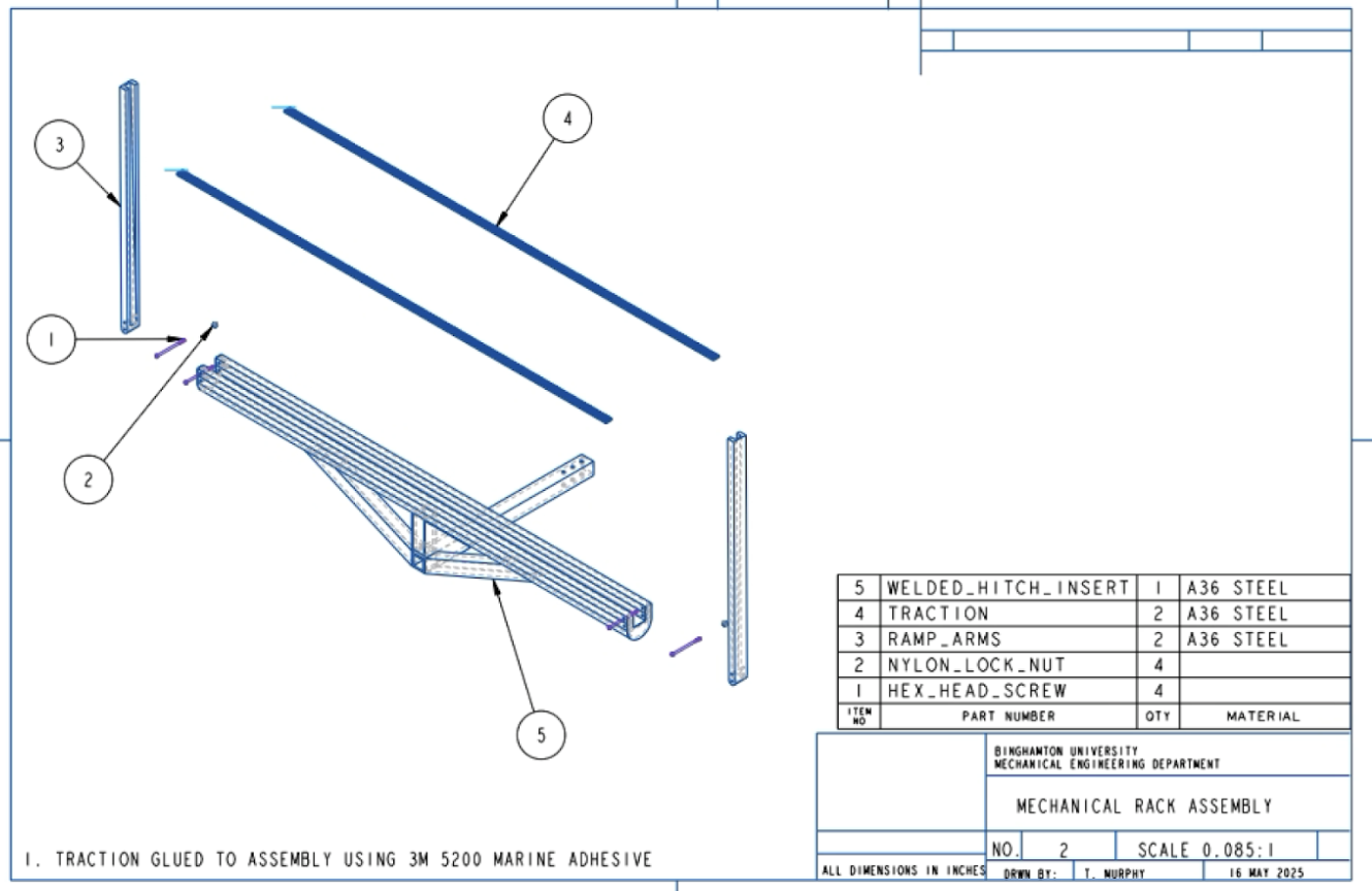 The complete assembly incorporates folding ramp arms, attached using hex bolts and nylon lock nuts to provide reliable, low-maintenance hinges. When closed, the ramp surface doubles as a hitch step, featuring EPDM rubber tread bonded with 3M 5200 Marine Adhesive for permanent adhesion, slip resistance, and weather durability.